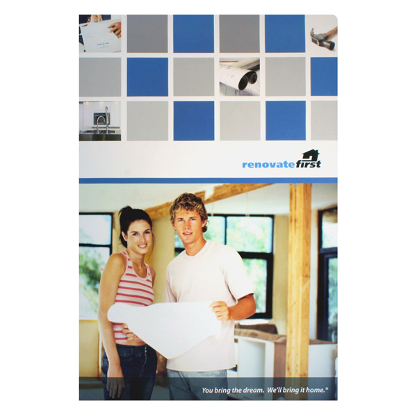 Four-color process printed on Side 1 of 120lb C2S White Gloss coated with Lamination-plastic gloss. H2 business card slits on the right pocket.