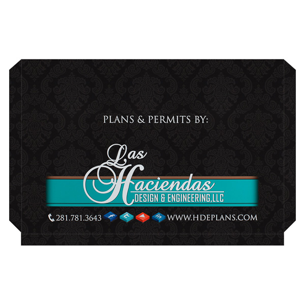 Las Haciendas presents engineering plans and permits in this stylish design. Black outer panels are printed with a subtle paisley pattern to create texture. Turquoise, white, and gold accents pop against the darker color and add a slightly western feel.