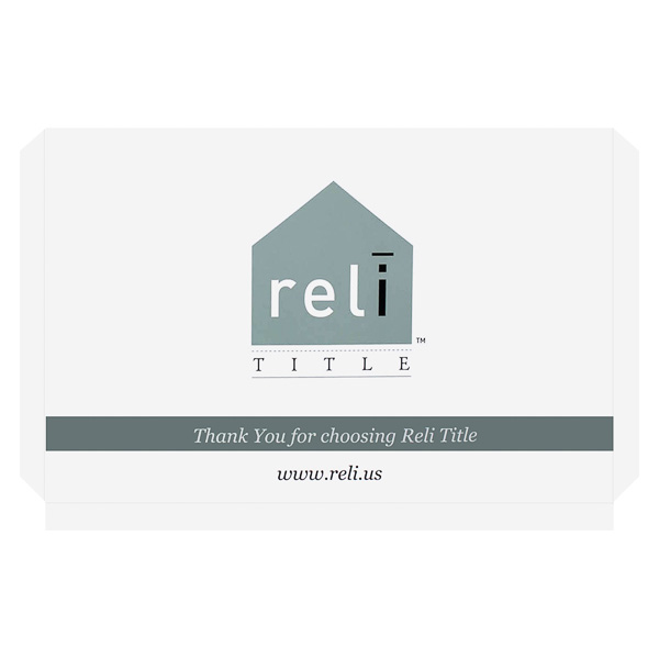 A house-shaped logo gives a nod to Reli Title's role as a real estate title and settlement service provider. Light gray accents have a green tint to soften the design.
