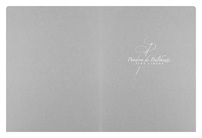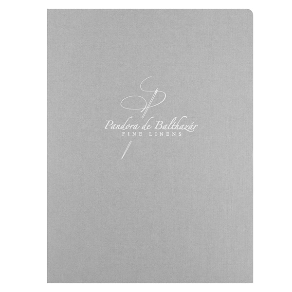 Delicate script typography has the same luxurious look as the fine linens sold by Pandora de Balthazar. The textile maker's name and needle-and-thread logo are in pristine white foil —ironically, on linen paper. Its surface mimics a close-up view of tightly woven cloth. As a subtle branding move, Pandora uses the needle and thread to create the scripted letter "P" in its logo, thus reminding clients of the brand name before they read it.