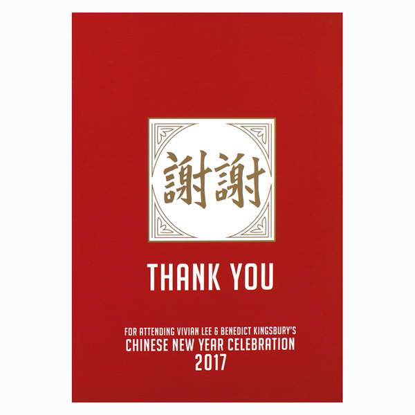 A bold red cover gets guests attention to thank them for attending the Vivian Lee & Benedict Kingsbury Chinese New Year Celebration. Gold accents around the Chinese writing make the design elegant and luxurious.