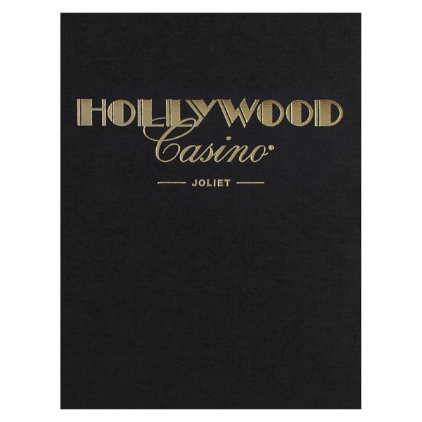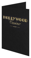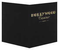 This photo folder design for Hollywood Casino exhibits luxury and class with its gold and black color scheme. A Metallic Gold foil stamp adds a smooth texture to the rough Black Linen stock. Hollywood's font is reminiscent of old Hollywood glam, while casino's script font adds more elegance to the design.