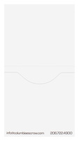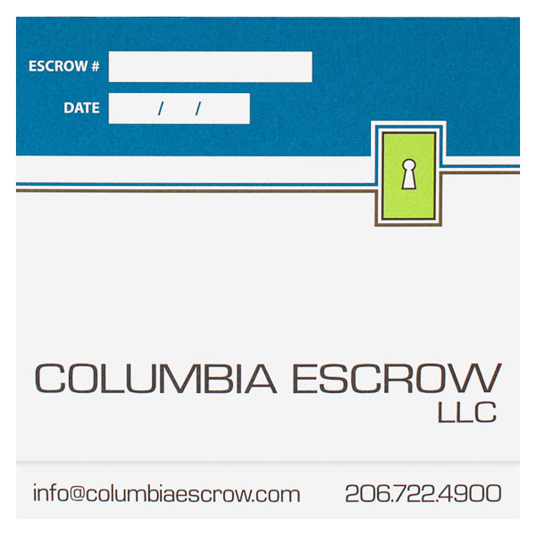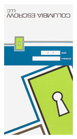 Columbia Escrow's lime green logo in the top right corner is bordered by two stripes, one of which matches the field of blue at the top. Customizable boxes let the company's staff write in each client's escrow number and date, while contact information is located at the bottom of the panel. The close-up key logo on back reinforces the brand's identity with a slight twist in perspective.
