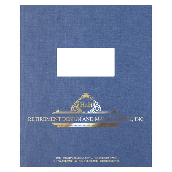 This two-piece design for H&H Retirement Design and Management uses thick linen stock, giving it a luxurious texture. The intricate logo stretches across the design for balance and is stamped in metallic gold. Its color warms the cool blue stock and adds a shiny surface to symbolize money and clients' "golden years." Best of all, the smooth foil stamp contrasts the textured stock for a memorable user experience.