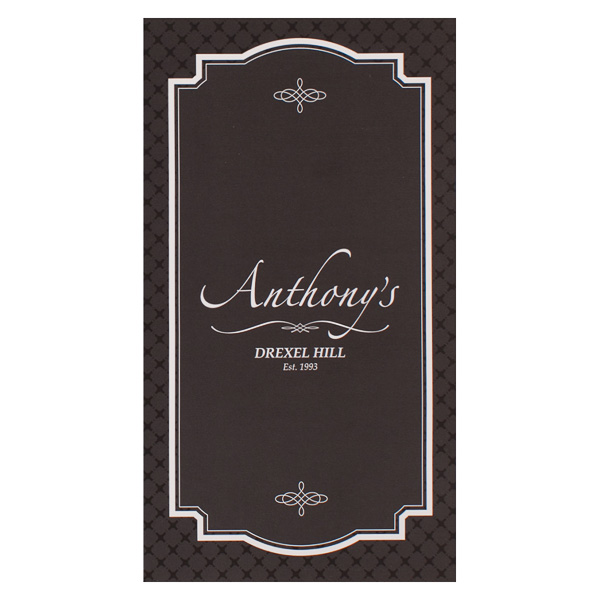 An elegant script and ornate border decorate the cover of this design for Anthony's Ristorante and Banquet Hall. Its location and year of establishment are also printed on the cover, which is adorned with intricate curlicues and a diamond-patterned background.