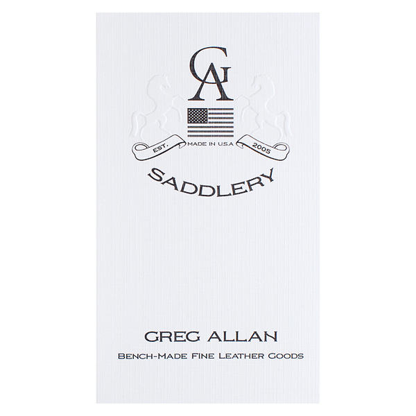 Serif lettering and thick linen stock create an elegant look that alludes to Greg Allan Saddlery's finely crafted leather goods. Embossed horses give the logo texture similar to the details on custom saddles, bags, or boots.