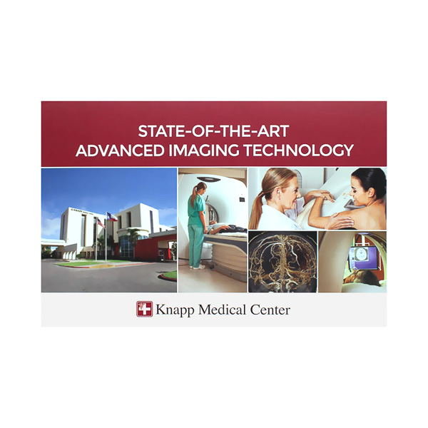 Knapp Medical Center's dark red color branding adds a warm, welcoming touch to this design. A collage of photos showcases its facility and imaging technology.