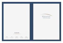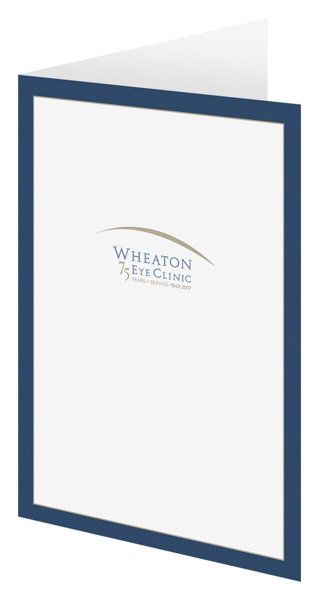 Wheaton Eye Clinic celebrates 75 years of service with this folder, which features the clinic's name and logo in the center of the cover and a professional blue border. A line above the name mimics the look of an eyebrow. Contact information is easy to find on the back.