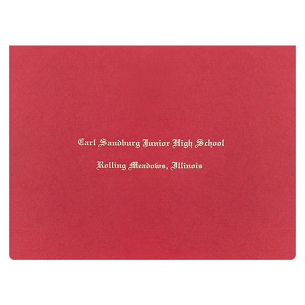 Vibrant red stock matches Carl Sandburg Junior High's school color to a tee and attracts attention to the award inside. CSJHS printed its school name on the cover in a decorative, vintage font that creates a sense of prestige. The metallic gold type reflects light and features positive color connotations of victory and success. The smooth foil also contrasts the slightly textured hopsack stock for a luxurious look and feel.