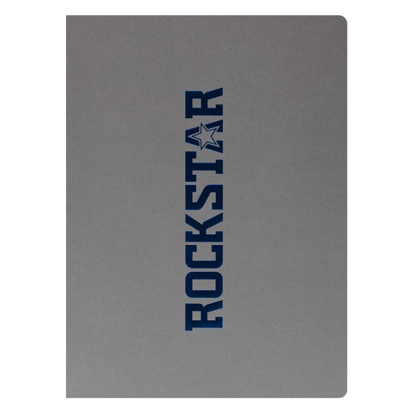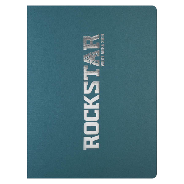Thick vertical letters in Metallic Sapphire foil attract the eye right away. Gray stock creates a brooding look that portrays rock music's dark tones and complements the sapphire's glitz and glam.