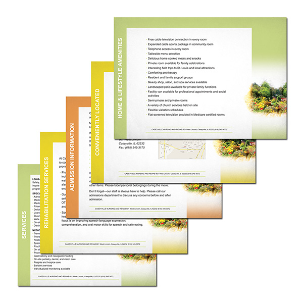 Light, summertime colors cheer seniors and highlight the benefits of living at Cahokia Nursing & Rehabilitation Center. The green, yellow, and orange borders match the landscaped flowers in the photo imprinted on each page. Columns of text with wide margins and large letters are easy for aging eyes to read. Each insert details a different aspect of life at Cahokia, from its amenities and location to its admissions procedures and health services.