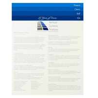 These stepped inserts for Vertical Systems Analysis have a professional gray and blue color scheme. A sans serif font makes the information easy to read. The inserts detail important information about the company and its staff, clients and projects.