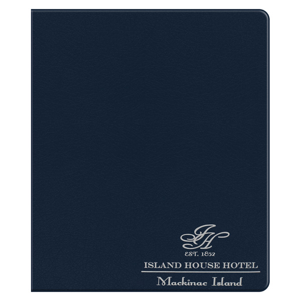 This elegantly simple binder from Island House Hotel is made from leather-like vinyl. It features the company's logo stamped in metallic bright silver foil in the lower right corner of the cover, which creates a sense of luxury and high class. The midnight blue color of the material is suggestive of mystery, professionalism and serenity.