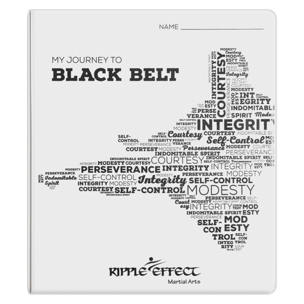 Ripple Effect Martial Arts has created a simple yet inspiring binder design. Their front panel showcases the main design element - a word cloud filled with motivating terms and shaped into a karate student performing a jump kick. The school's name utilizes an Eastern style font to match to martial arts theme.