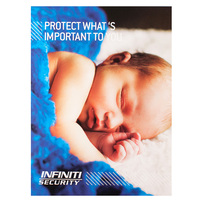 Infiniti Security emphasizes its slogan with a photo of the person a family most wants to protect—a sleeping infant. The logo at the bottom balances the tagline at the top, as the blue blanket uses color branding to imply security.