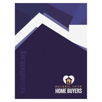 Blue and white lines take the shape of a house, alluding to National Faith Home Buyers' role in helping people move into their new homes. Yellow text adds a touch of warmth to the logo. The large-print URL is written in blue, blending subtly into the cover.