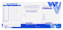 The blue and white color branding continues on the three pockets, which are labeled to help clients organize their documents. The right exterior panel houses important job details, and a multi-color printing disclaimer appears on the back along with a place for approval.
