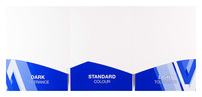 Four-color process printed on Side 1 of 12pt C1S White Semi-Gloss stock. Coated with Gloss Aqueous. B5 brochure slit on left pocket, with V4 business card slits on right pocket.