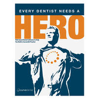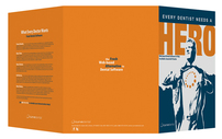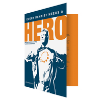 Curve Dental stands out in its industry with an atypically artistic cover design. Replacing the usual images of smiling dental technicians in white lab coats, contrasting blue and white areas use shadows and outlines to create an illustrated male character striking a heroic pose as he reveals the superhero symbol on his T-shirt. The bright orange accents emphasize the man's identity.