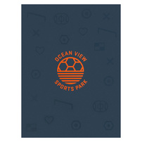 Ocean View Sports Park chose an energetic and youthful design for its folder. The cover features the complex's name and logo in the center in bright orange on a gray background. Clear foil stamped images associated with soccer and children cover the front and back. The logo looks like a soccer ball rising over the bay.