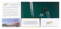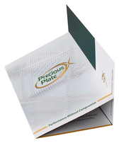 Side 1 printed with four-color process and 1 embossed area. Side 2 printed with four-color process. 12pt C2S White Semi-Gloss stock coated with Gloss Aqueous. H1 business card slits on right pocket.