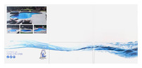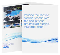 Contact information is prominently displayed under photos of an in-ground pool. Waves of water across the pockets lead the viewer to the documents inside, while the brand logo reappears on the back to reinforce B&L's identity.