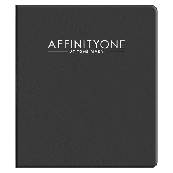 Front cover printed with 1 PMS color on uncoated Black French Calf Dull Vinyl. 3/4" silver metal rings.