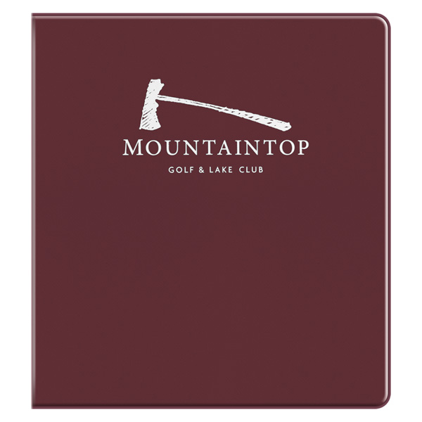 Front and back covers and spine printed with 1 PMS color on uncoated Burgundy French Calf Dull Vinyl. 1 1/2" metal rings.