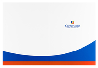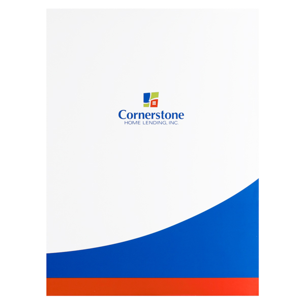 Sweeping blue and orange lines borrow from Cornerstone Home Lending's brand colors. Royal blue implies stability, while orange hints at efficiency in obtaining home loans. Orange interior pockets highlight the mission statement at right. The cover's blue and orange stripes curve onto the back to tie both outer panels together.