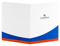 Four-color process printed on Side 1 of 14pt C2S White Semi-Gloss stock coated with Gloss Aqueous. B2 business card slits on left pocket, with H1 business card slits on the right pocket.
