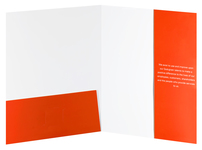 A neutral beige slope runs from the bottom to the edge of the cover to encourage clients to look inside. Aqueous-Soft Touch coating makes the cover feel like velvet. Energetic orange pockets are inside.